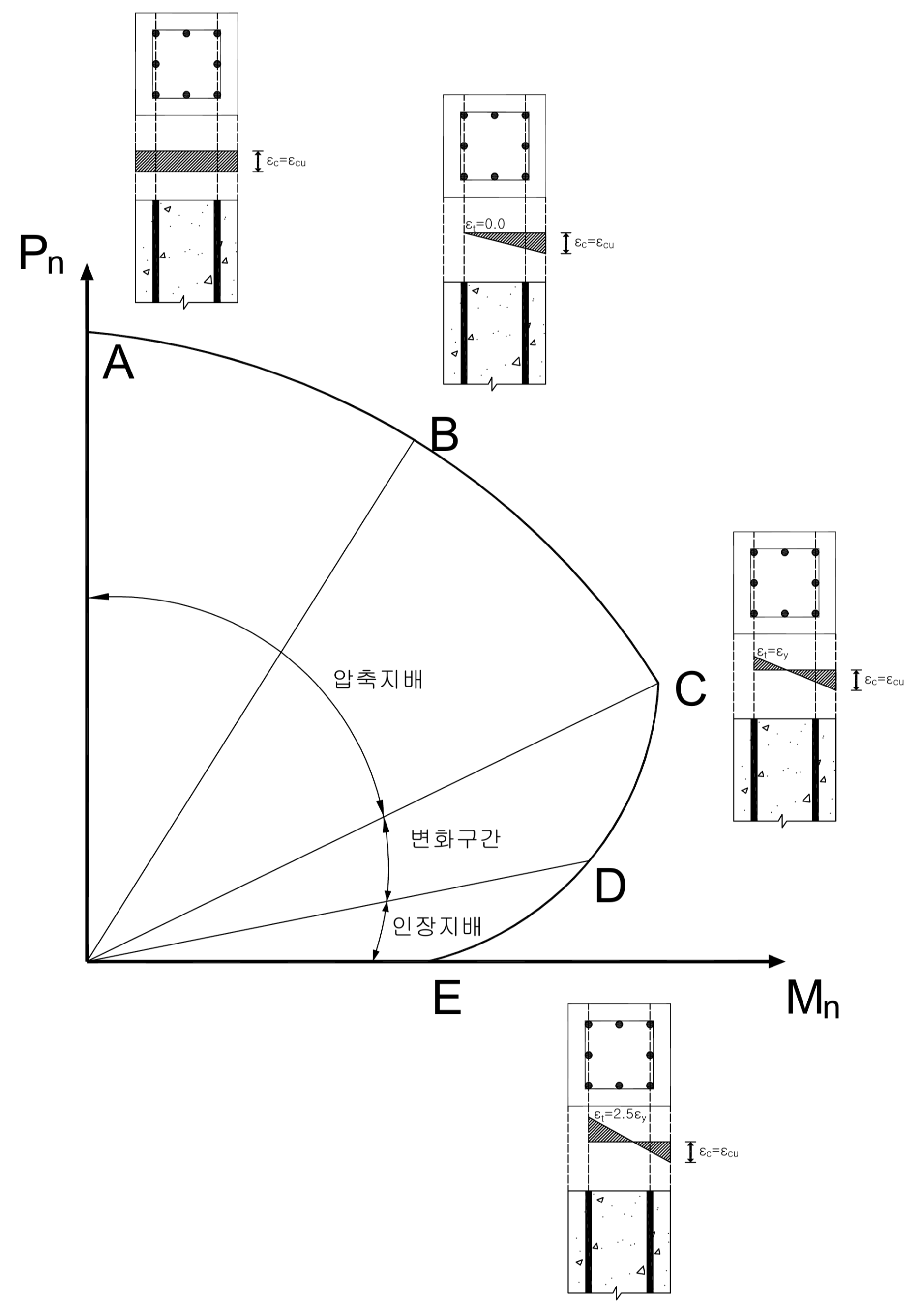 - E점 : 휨모멘트가 점점 증가하여 축하중은 0이 되는 상태로 휨모멘트만 존재하는 휨 거동을 하는 보가 됩니다.