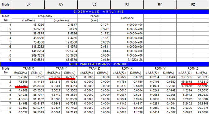 여기서, 구조물의 자유도 수만큼 진동모드가 존재합니다. 실제 구조물은 이러한 다중모드가 중첩되어 복합적인 진동형상을 보이게 됩니다. 이러한 여러개의 모드형상 중에서 질량참여율이 가장 높은 모드형상이 존재합니다. 질량참여율은 구조물 전체의 질량중에서 몇 퍼센트의 질량이 해당 모드에 기여하는지를 나타내는 지표입니다. 예를들어서 아래의 고유치해석결과를 예로 설명드리겠습니다.