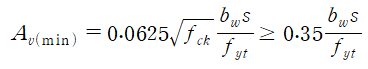 최소 전단철근은 계수전단력이 콘크리트에 의한 설계전단강도의 0.5배를 초과하는 모든 구간에서 배치해야합니다. 예외조항이 있으며 예외조항은 1편에서 작성해 두었으니 확인해 보시길 바랍니다. 건축구조기준에서는 최소전단철근을 다음과 같이 규정하고 있습니다.