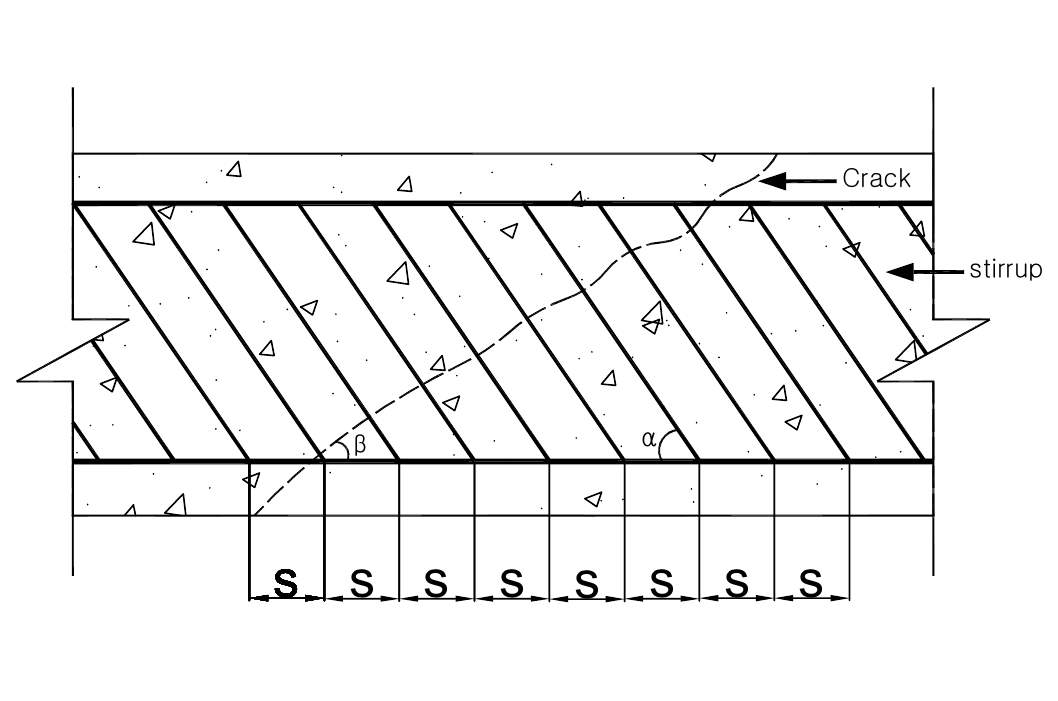 일반적인 해를 유도하기 위해서 균열 경사각도는 β, 스터럽의 경사각도는 α로 가정하겠습니다.