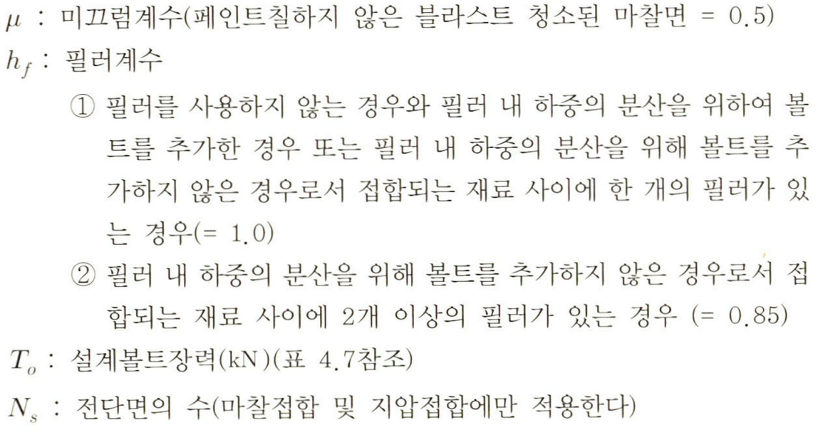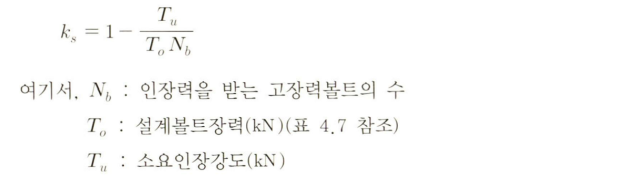 마찰접합에서 인장하중으로 인해 고장력볼트의 장력이 감소하면 아래의 식을 사용하여 설계미끄럼강도를 감소시킨다.