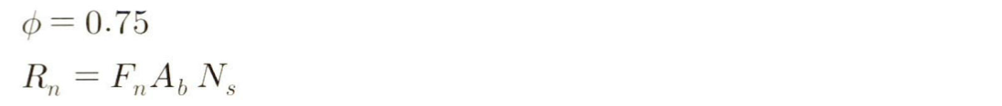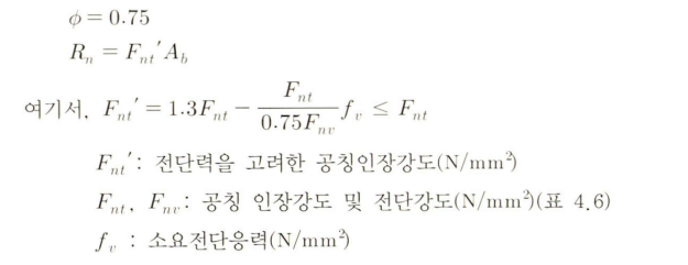 지압접합에서 인장과 전단의 조합력을 받는 경우, 고장력볼트의 설계강도는 다음과 같이 결정합니다.