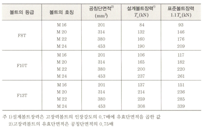 <고장력볼트의 볼트호칭, 공칭단면적, 설계볼트장력 및 표준볼트장력>