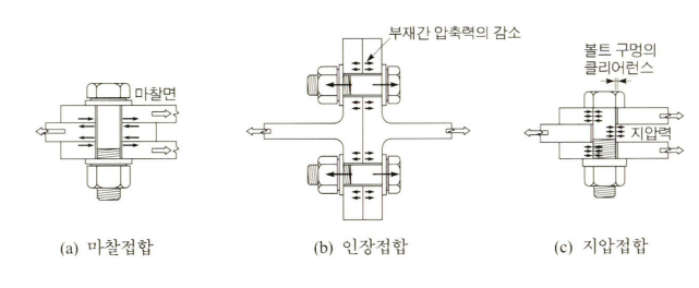 고장력볼트 접합방법의 종류는 마찰접합, 인장접합, 지압접합이 있습니다.