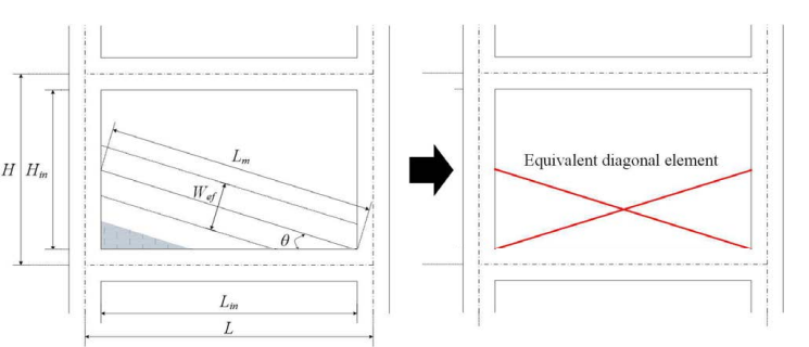 그렇기 때문에 내진성능평가에서는 이러한 조적허리벽을 모델링해야합니다. 그 방법 중 하나가 등가대각압축가새(equivalent diagonal strut)입니다. 해당 내용은 FEMA 356에서 제시하는 방법이며 현재 우리나라의 내진성능평가 매뉴얼과 많은 연구에서도 해당 방법을 사용하여 해석모델을 수립하고 있습니다.