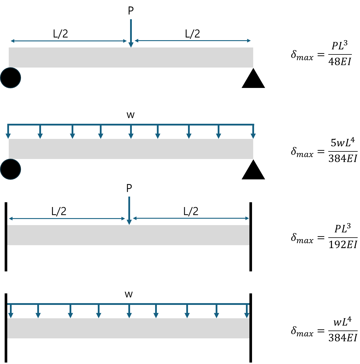 위의 그림은 몇가지 하중형태와 경계조건에 대한 탄성처짐 공식을 보여줍니다. 이외에도 다양한 유형의 하중상태와 경계조건에 대해서 처짐량을 계산할 줄 알아야합니다. 해당 내용은 기회가 될때 다루어 보도록 하겠습니다.
