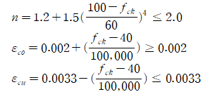 또한, 중요한 것은 설계압축강도에 0.85를 곱하는 것인데 이것은 최대응력이 유지되는 곡선을 적용할 때 발생할 수 있는 과대평가를 방지하고, 압축강도 시험용 공시체와 실제 구조물의 형상과 크기의 차이에 따른 보정, 장기하중에 의한 크리프로 강도가 감소하는 현상을 반영한 것입니다.