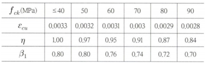 여기서, 에타는 콘크리트 직사각형 등가압축응력블록의 크기를 나타내는 계수입니다. 건축구조기준에서는 아래의 표로 위의 변수들을 결정할 수 있도록 제시되어 있습니다.