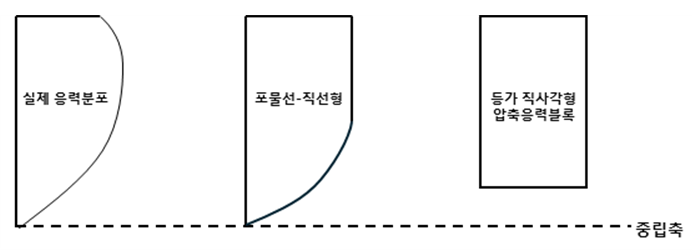 등가직사각형 압축응력블록은 아래의 그림처럼 비선형분포를 직사각형의 압축응력블록으로 가정한 형태입니다.