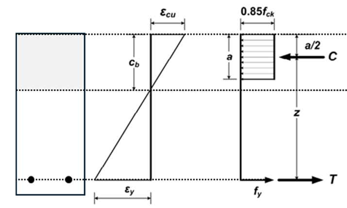 여기서 압축응력의 합력은 다음과 같이 산정합니다.