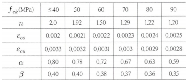 여기서, 에타는 콘크리트 직사각형 등가압축응력블록의 크기를 나타내는 계수입니다. 건축구조기준에서는 아래의 표로 위의 변수들을 결정할 수 있도록 제시되어 있습니다.
