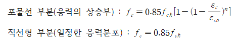 또한, 중요한 것은 설계압축강도에 0.85를 곱하는 것인데 이것은 최대응력이 유지되는 곡선을 적용할 때 발생할 수 있는 과대평가를 방지하고, 압축강도 시험용 공시체와 실제 구조물의 형상과 크기의 차이에 따른 보정, 장기하중에 의한 크리프로 강도가 감소하는 현상을 반영한 것입니다.