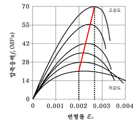 -보통강도(40MPa이하) 콘크리트의 변형률 : 최대 응력에서 변형률이 대략 0.002