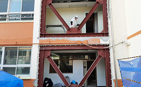 구조물의 내진보강에는 부재보강과 시스템보강 그리고 특허공법을 사용한 연성보강 등이 있습니다. 부재보강은 벽체 및 기둥, 보의 강도를 강화하기 위한 방법으로 철판 보강, 섬유 보강(FRP, Fiber Reinforced Polymer) 등을 사용합니다. 시스템 보강은 구조물의 전반적인 강도, 강성을 높이기 위해서 전단벽을 신설하거나 철골가새골조를 구조물에 보강하여 내진성능을 전반적으로 끌어 올립니다. 또한, 특허공법을 사용한 건물의 연성을 높이기 위해 제진 장치(dampers)나 면진 장치(base isolators)를 설치합니다. 하지만 오래전에 건설된 학교시설물에는 연성 보강보다는 강성보강이 적합할 것으로 생각합니다.