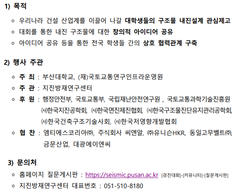안녕하세요! 오늘은 2024년 구조물 내진설계 경진대회에 대해서 설명해 드리도록 하겠습니다. 해당 경진대회는 대학생을 대상으로 하는 공모전으로 건축공학을 전공으로 하시는 학생분들은 공모전에 참여해서 포트폴리오에 넣을 수 있는 실적과 취업하실 때 자기소개서에 쓸 수 있는 내용을 추가로 챙겨가시길 바랍니다.😉